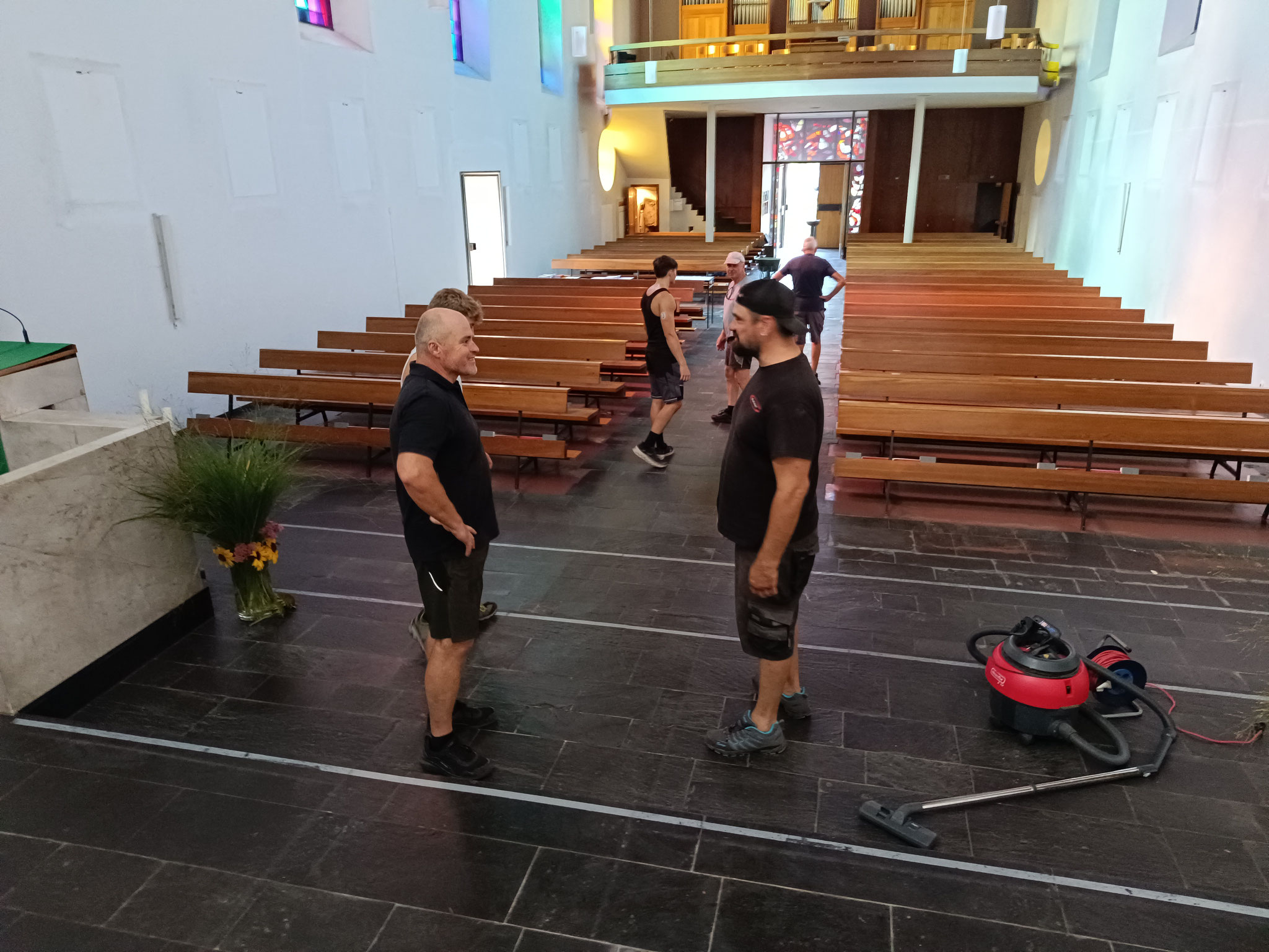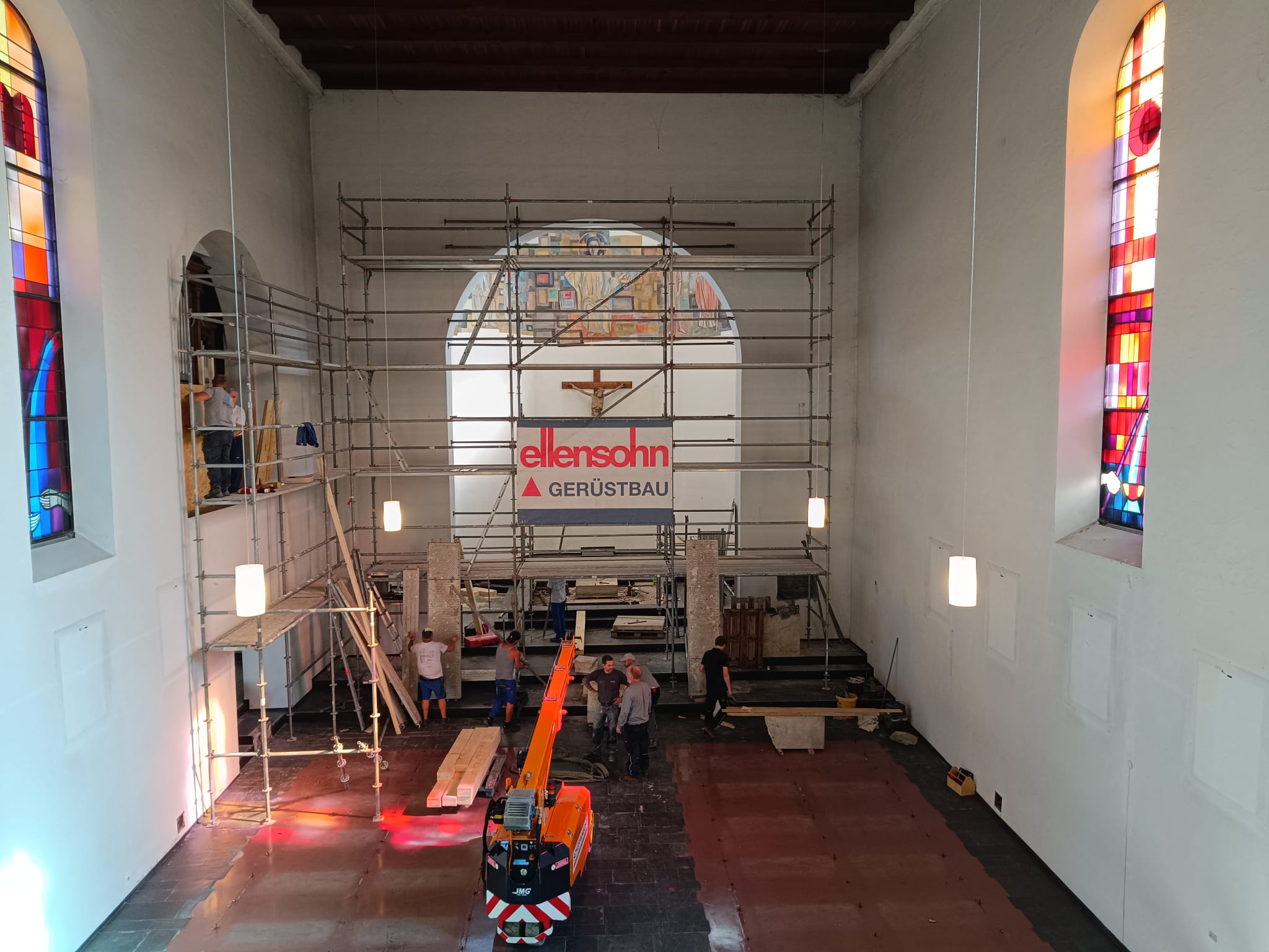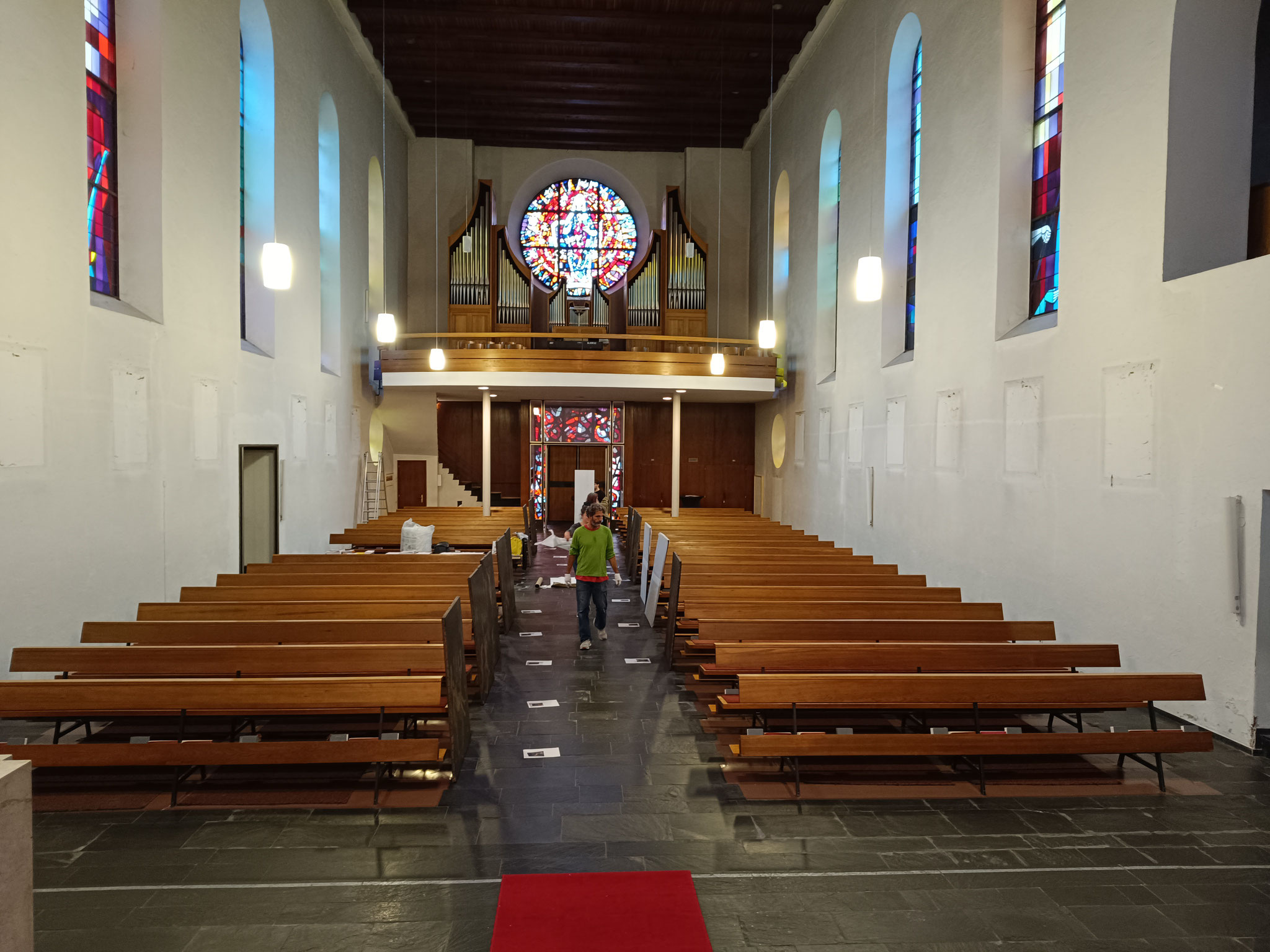 Pünktlich um 07:00 Uhr waren die Arbeiter am ersten Tag zur Stelle und haben die Baustelle eingerichtet. Unsere Mesner hatten noch alle Hände voll zu tun, die Sakristei nun ganz auszuräumen, auch mussten noch alle Liederbücher verstaut werden. Dann wurden gleich die Bänke ausgebaut und der große Altar im Querschiff in Sicherheit gebracht. Gleich am ersten Tag ging es rund auf unserer Großbaustelle!