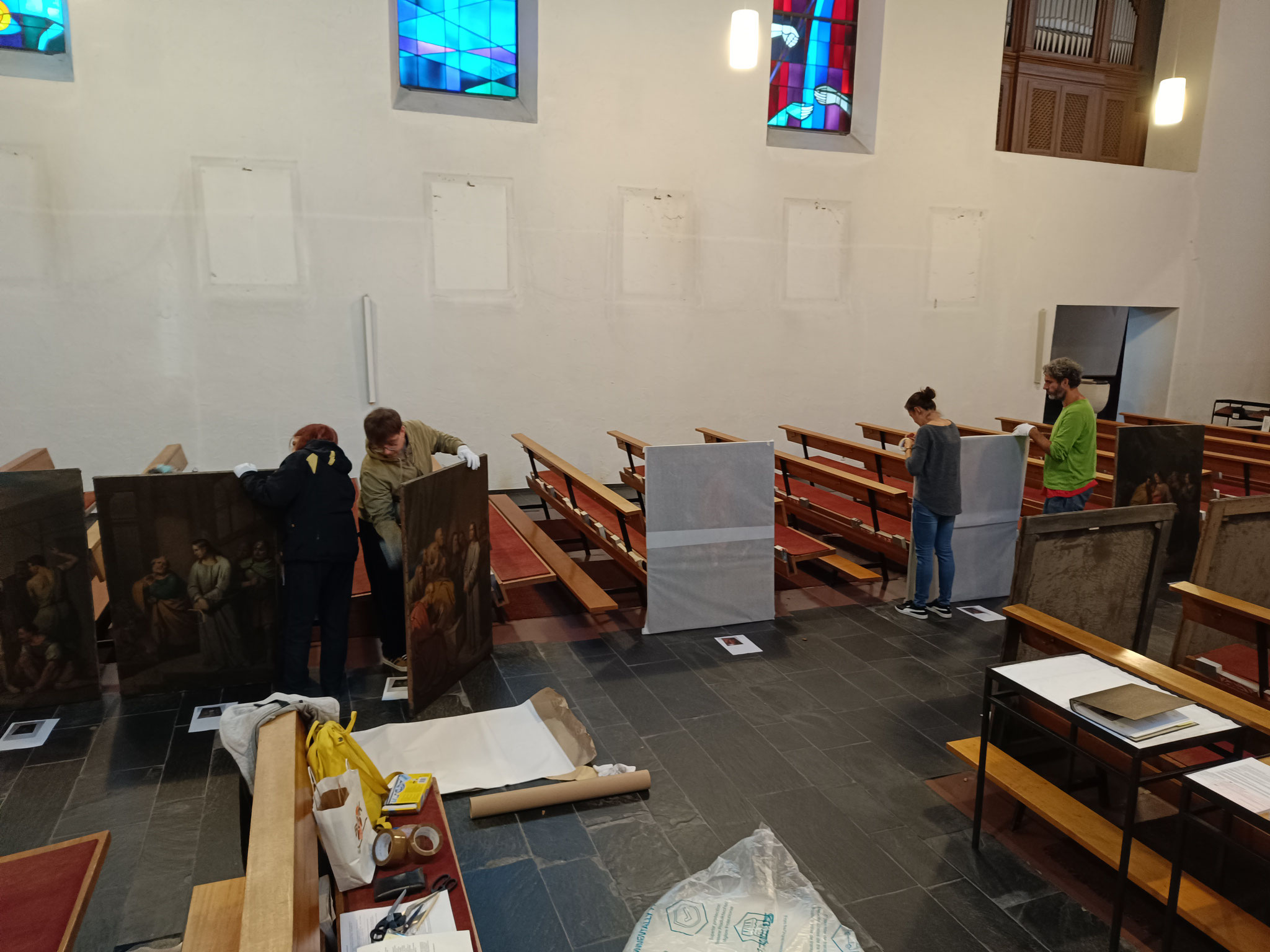 Am 10. September 2025 wurden die Kreuzwegbilder, die als Leihgabe der Stadt Feldkirch seit Oktober 1978 in der Pfarrkirche angebracht waren, behutsam abgenommen, verpackt und ins Archiv der Stadt Feldkirch gebracht. Tags darauf kamen die Heiligenfiguren ins Diözesanarchiv, wo sie unter optimalen klimatischen Bedingungen gut aufgehoben sind. Die beiden Pfarrpatrone Pankratius und Zeno finden dann einen besonderen Platz in der neu renovierten Kirche. Am 20. September 2025 hat ein motivierter Trupp freiwilliger Helfer einen erheblichen Teil alter oder kaputter Gegenstände ausgeräumt, darunter die alten Teppiche, Blumenvasen, vom Holzwurm befallene Bretter und einiges mehr, das nicht mehr verwendet wird. Gleichzeitig konnte auch so mancher Sperrmüll, der sich im Dachboden und im Keller vom Pfarrhaus angesammelt hat, entsorgt werden. Der Anhänger, den die Fa. Lins & Lins zur Verfügung gestellt hat, war bald gefüllt und wurde noch am selben Nachmittag abtransportiert. Danke allen Beteiligten für die gelungene Aufräumaktion!