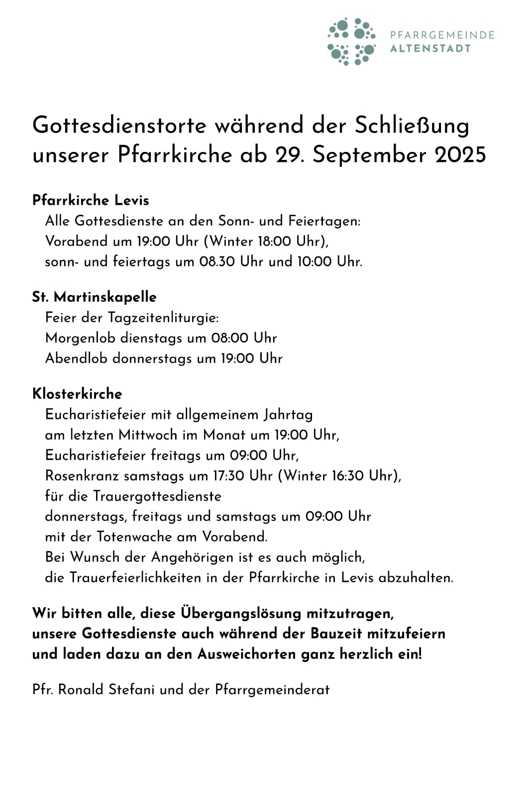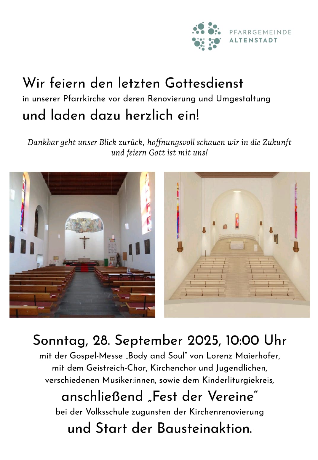 Wir laden ein zum letzten Gottesdienst in unserer Pfarrkirche, verbunden mit einem "Fest der Vereine" und informieren über die Ausweichorte